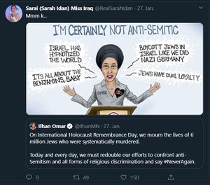 تتخذ سارة عيدان موقفًا مضادًا للنائبات عن الحزب الديمقراطي ليندا صرصور ورشيدة طليب والهان عمر. اتضح موقفها من خلال ما تنشره على حسابها في تويتر.