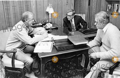 الفريق الأمريكي في مفاوضات كامپ ديڤد: الرئيس جيمي كارتر، يسار، وزير الدفاع هارولد براون، وسط، وزير الخارجية سايروس ڤانس، سبتمبر 1978.