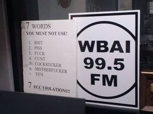 ملصق في غرفة التسجيل لمحطة WBAI تحذر المذيعين من استخدام الكلمات السبع القذرة.