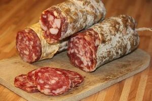 Dry fermented sausage ('salami aeros') is an important product of the Greek meat industry with an annual production of about 10,000 tons.[32] Its manufacture varies depending on the skill and experience of the meat manufacturer rather than a process solely based on scientific and technological means of production.[32] This type of traditional sausage, which undergoes spontaneous fermentation, is of superior quality compared to those inoculated with starters and made at industrial scale.[32] This type of traditional salami is often more expensive due to its high quality.