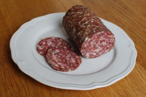 The word 'salami' in English comes from the plural form of the Italian salame[1] (النطق بالإيطالية: [saˈlaːme]). It is a singular or plural word in English for cured meats of a European (particularly Italian) style. In Romanian, Bulgarian, and Turkish, the word is salam; in Macedonian and Serbo-Croatian it is salama; in Hungarian, it is szalámi; in Czech it is salám; in Slovak, it is saláma; in Russian, Ukrainian, and Belarusian it is salyami while Polish, French, German, Greek and Dutch have the same word as English. The name may be derived from the Latin word salumen.[2][محل شك]
