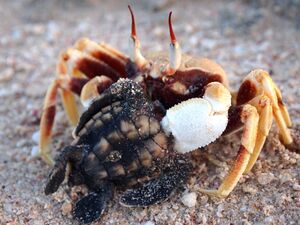The loggerhead sea turtle is omnivorous, feeding mainly on bottom-dwelling invertebrates, such as gastropods, bivalves, decapods, and horseshoe crabs.[51] It has a greater list of known prey than any other sea turtle. Other food items include sponges, corals, sea pens, polychaete worms, tube worms, sea anemones, cephalopods, barnacles, brachiopods, amphipods, isopods, Portuguese men o' war, insects, bryozoans, hydrozoans, sea urchins, sand dollars, sea cucumbers, starfish, tunicates, fish (eggs, juveniles, and adults), hatchling turtles (including members of its own species), algae, and vascular plants.[52][53] During migration through the open sea, loggerheads eat jellyfish, floating molluscs, floating egg clusters, squid, and flying fish.[9]