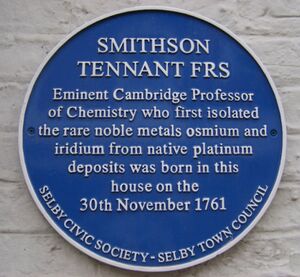 Tennant was born in Selby in Yorkshire. His father was Calvert Tennant (named after his grandmother Phyllis Calvert, a granddaughter of Cecilius Calvert, 2nd Baron Baltimore). His own name derives from his grandmother Rebecca Smithson, widow of Joshua Hitchling. He attended Beverley Grammar School and there is a plaque over one of the entrances to the present school commemorating his discovery of the two elements, osmium and iridium. He began to study medicine at Edinburgh in 1781, but after a few months moved to Cambridge, where he devoted himself to botany and chemistry. He graduated M.D. at Cambridge in 1796,[3] and about the same time purchased an estate near Cheddar, where he carried out agricultural experiments. He was appointed professor of chemistry at Cambridge in 1813, but lived to deliver only one course of lectures, being killed near Boulogne-sur-Mer by the fall of a bridge over which he was riding.