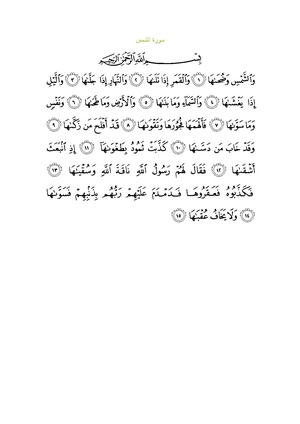 قالب:MultiReplace -قالب:MultiReplace ﴿كَذَّبَتۡ ثَمُودُ بِطَغۡوَىٰهَاۤ ١١ إِذِ ٱنۢبَعَثَ أَشۡقَىٰهَا ١٢ فَقَالَ لَهُمۡ رَسُولُ ٱللَّهِ نَاقَةَ ٱللَّهِ وَسُقۡیَـٰهَا ١٣ فَكَذَّبُوهُ فَعَقَرُوهَا فَدَمۡدَمَ عَلَیۡهِمۡ رَبُّهُم بِذَنۢبِهِمۡ فَسَوَّىٰهَا ١٤ وَلَا یَخَافُ عُقۡبَـٰهَا ١٥﴾