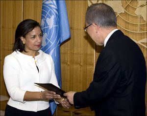 وخلال تقديم أوراق اعتمادها إلى الأمين العام للأمم المتحدة بان كي مون يوم 26 يناير , حظيت رايس باستقبال دافئ من طرف عدد من المندوبين وأدلت بتصريحات صحفية مثيرة للتفاؤل تعهدت فيها بإحداث "تغييرات" في تعامل واشنطن مع المنظمة الدولية. [7]