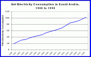 ونظراً لانخفاضِ أسعارِ الطاقة نسبياً فقد كانَ الطلبُ على الكهرباء في المملكة غير مقيد في الماضي، أي أنّه لا يوجد نظام تحكم بأسعارِ الطاقة وحيث لم تدخل مفاهيم ترشيد الطاقة آنذاك. وقد بلغت ذروة الطاقة المستهلكة واقتربت إلى حدٍّ كبير من حجمِ القدرةِ المركّبة في عام 1999م ممّا أدّى إلى انقطاعِ الكهرباء في فترات معينة من صيفِ ذلك العام، وقد ازدادَ الطلبُ على الطاقة ازدياداً غير متوقع مما تسبّب ذلك إلى مضاعفةِ الطلب على الكهرباء بمعدّل رقمين متتاليين في الزيادة السنوية، وبنفس الأسلوب ارتفعت ذروة استهلاك الطاقة بنفس الزيادة السابقة، أنظر إلى الجدولِ المرفق وشكل (1). وعلى أية حالٍ في الخمس سنوات  الماضية ارتفعت أسعارُ الطاقة بمعدّل أكثر من 30٪ لكل من النفطِ ومشتقاته والكهرباء معاً، وهذا بدورهِ أدّى إلى التفكيرِ جدياً في تشجيعِ مفاهيم المحافظة على الطاقة وترشيدها. يوضحُ شكل (2) ثلاث تنبؤات (سيناريوهات) للطاقة تتمثلُ بالطلب الذروي (ميجاوات) حتى عام 2020م وذلك استناداً إلى نتائجِ الدراسة التي صدرت مؤخراً عن معهد تل آس " Tellus " وفريق سعودي من إدارةِ / أقسام تخطيط الطاقة الكهربائية، حيث أنّ معظم التنبؤات السابقة لِنُمُوّ الطلبِ على الطاقة في الفترة 1999م إلى 2004م أعطت النتائجُ التالية: