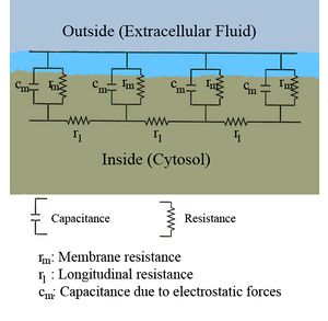 where V(x, t) is the voltage across the membrane at a time t and a position x along the length of the neuron, and where λ and τ are the characteristic length and time scales on which those voltages decay in response to a stimulus. Referring to the circuit diagram above, these scales can be determined from the resistances and capacitances per unit length[6]