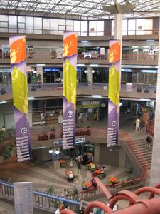 Multi-level shopping arcade in Mercaz Clal, a 15-story office tower erected in 1972 at 97 Jaffa Road, near Mahane Yehuda shuk, largely deserted most of the day.