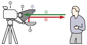 4. مرآة خاصة عاكسة من جهة وشفافة من الجهة الأخرى تركب أمام العدسة بزاوية مقادرها 45° بحيث لا تحجب الصورة عن العدسة فتتمكن من التقاط صورة المذيع.