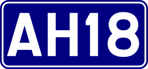 The project new highway route numbers begin with "AH", standing for "Asian Highway", followed by one, two or three digits.[4] Single-digit route numbers from 1 to 9 are assigned to major Asian Highway routes which cross more than one subregion.[4] Two- and three-digit route numbers are assigned to indicate the routes within subregions, including those connecting to neighbouring subregions, and self-contained highway routes within the participating countries.[4] Route numbers are printed in the Latin script and Hindu-Arabic numerals and may simply be added to existing signage, like the E-road network.[4]