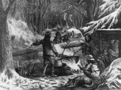 تصوير من القرن 19، "صناعة السكر بين الهنود في الشمال" (لاحظ استخدام الأوعية المعدنية، نتيجة الاتصال بالاوروبيين)