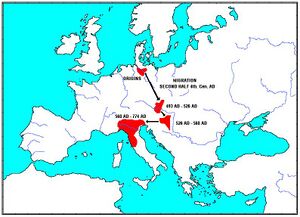 After the fall of the Western Empire, Northern Italy suffered heavily from destruction brought about by migration from Germanic peoples. In 493 the Ostrogoths managed to create a stable and prosperous kingdom, with its capital first in Ravenna and then in Pavia, but the Gothic War caused the kingdom to fall and devastated the region. In the 570s the Germanic Lombards, or Longobardi, entered Northern Italy from Friuli and founded a long-lasting reign (with its capital in Pavia) that gave the medieval name to the whole Northern Italy and the current name to the Lombardy region. After the initial struggles, relationships between the Lombard people and the Latin-speaking people improved. In the end, the Lombard language and culture assimilated with the Latin culture, leaving evidence in many names, the legal code and laws, and other things. The end of Lombard rule came in 774, when the Frankish king Charlemagne conquered Pavia, deposed Desiderius, the last Lombard king, and annexed the Lombard Kingdom to his empire changing the name in Kingdom of Italy. The former Lombard dukes were mostly replaced by Frankish counts, prince-bishops or marquises.