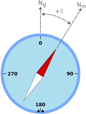 يكون الميل المغناطيسي موجباً عندما يكون الشمال المغناطيسي في شرق الشمال الجغرافي.