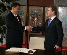 أسس شي علاقات أقوى مع روسيا، لا سيما في أعقاب أزمة أوكرانيا لعام 2014. ويبدو أنه طور علاقة شخصية قوية مع الرئيس ڤلاديمير پوتن. يُنظر إلى كليهما كقادة أقوياء لهم توجهات قومية لا يخشون تأكيد أنفسهم ضد المصالح الغربية.[152]حضر شي مراسم افتتاح دورة الالعاب الاولمبية الشتوية لعام 2014 في سوتشي. وبسلطة شي ، وقعت الصين على 400 مليار دولار صفقة الغاز مع روسيا ؛و أصبحت الصين أيضا أكبر شريك تجاري لروسيا.[152]