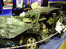 Road traffic accidents usually involve impact loading, such as when a car hits a traffic bollard, water hydrant or tree, the damage being localized to the impact zone. When vehicles collide, the damage increases with the relative velocity of the vehicles, the damage increasing as the square of the velocity since it is the impact kinetic energy (1/2 mv2) which is the variable of importance. Much design effort is made to improve the impact resistance of cars so as to minimize user injury. It can be achieved in several ways: by enclosing the driver and passengers in a safety cell for example. The cell is reinforced so it will survive in high speed crashes, and so protect the users. Parts of the body shell outside the cell are designed to crumple progressively, absorbing most of the kinetic energy which must be dissipated by the impact.