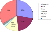 - Royal Dutch Shell — Shell acted through following associated companies: the Caspian Black Sea Society, Caucasus, S.M. Shibayev, and Co. Shell-led consortium produced a fifth of Russian output up to 1914. Royal Dutch Shell's output from the Baku oil fields was 15,000 boppd in 1914.