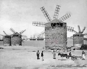 الوصف : الوصف الخارجي : عبارة عن شكل اسطواني دائري مكون من دائري سفلي يعلوه جزء دائري علوي على ارتفاع ثلاثة مداميك من الحجر الأبيض ثم نجد بدن الطاحونة وهو دائري من الحجر الأبيض ويوجد به عروق خشبية دائرية وظيفتها تخفيف الحمل على مداميك الحجر وإمتصاص أي هزات ويعلوها من أعلى المخروط المقبب ويرتكز على جزء خشبي دائري يتكئ على الطاحونة من أعلى والمدخل يوجد في الجهة القليب وهو عبارة عن شكل مستطيل يتوجه عقد نصف دائري ويتقدم المدخل سبع درجات من السلالم ويفتح في بدن الطاحونة ثلاث نوافذ نافذتان في الجهة البحرية ونافذة في الجهة الشرقية وهما عبارة عن شكل مستطيل وغرضهما الإنارة والتهوية.