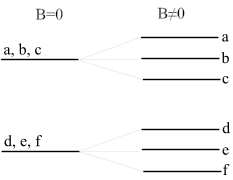 وطبقا للرسم التوضيحي ، تتسم التوزيعات a, b, c بحالة واحدة للطاقة ، كا ينطبق هذا علي التوزيعات d, e, f التي توجد في حالة طاقة محددة منخفضة عن حالة a, b, c . وفي وجود المجال المغناطيسي تنشق مستويات الطاقة . وينتج عن ذلك انه بينما كان يظهر لنا الانتقال من a, b, c إلى d, e, f في خط واحد ، يصبح لدينا عدة خطوط بسبب وجود عدة من الإنتقالات الممكنة بين a, b, c و d, e, f .