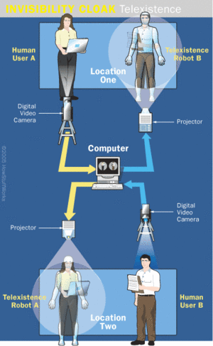 ومن المثير للاهتمام ، أن إمكانية واحدة لتطبيق هذه التكنولوجيا في الواقع تدور حول صنع الأشياء أكثر وضوحا. ويسمى مفهوم telexistence المتبادل أنه ينطوي أساسا على عرض منظر المستخدم البعيد على روبوت مغطى بمواد عاكسة للضوء. ويقول جراح كان يعمل على مريض عن طريق جهاز التحكم عن بعد في جراحة روبوتية. إن telexistence المتبادلة تقدم مساعدة للأطباء حيث تبعث على الاعتقاد بأن انهم يجرون الجراحة وليس الروبوت.