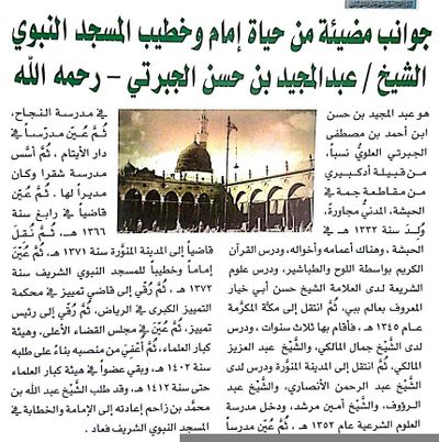 عبد المجيد حسن عبد المجيد (1332 هـ/1914 - 2017) عضو هيئة كبار العلماء السعودية سابقاً. وإمام الحرم المدني هو عبد المجيد بن حسن بن أحمد بن مصطفى الجبرتي، بقرية قلقالة من قبيلة أدكبيري من مقاطعة جمة في الحبشة. انتقل إلى مكة المكرمة عام 1345 هـ، فأقام بها ثلاث سنوات، ودرس على عدد من مشايخها ثُمَّ انتقل إلى المدينة المنوَّرة ودرس فيها ودرّس. تولى القضاء في عدد من المناطق وتدرج في سلك القضاء حتى مجلس القضاء الأعلى ثم عين عضواً في هيئة كبار العلماء، وبقي فيها حتى سنة 1412 هـ، عين إماما وخطيبا للمسجد النبوي سنة 1372هـ بدأ الصلاة بالمسجد النبوي مساعداً للشيخ عبد العزيز بن صالح يعاونه في الصلوات الخمس، وينوب عنه في جميعها، وفي الخطبة عند غيابه، ويشترك معه في صلاتي التراويح والقيام.