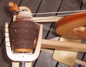 The double drive wheel is named after its drive band, which goes around the spinning wheel twice. The drive band turns the flyer, which is the horse-shoe shaped piece of wood surrounding the bobbin, as well as the bobbin. Due to a difference in the size of the whorls (the round pieces or pulleys around which the drive band runs) the bobbin whorl, which has a smaller radius than the flyer whorl, turns slightly faster. Thus both the flyer and bobbin rotate to twist the yarn, and the difference in speed winds the yarn onto the bobbin when the spinner lets up tension on the newly spun yarn, and spins the bobbin and flyer together to add spin to the yarn when the spinner keeps the new yarn under tension (in this case, the drive band will slip slightly in the groove in the bobbin, flyer whorl, or both). Generally the speed difference or "ratio" is adjusted by the size of the whorls and the tension of the drive band.[26]