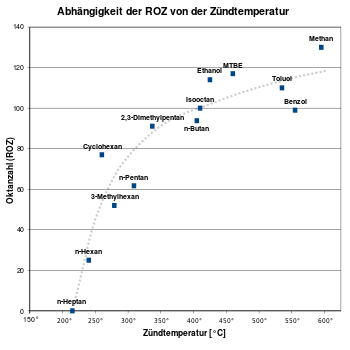 يبين المنحنى البياني العلاقة بين رقم الأوكتان ودرجة حرارة الاشتعال بين 200 و 600 درجة مئوية لعدة من أنواع الوقود المختلفة . ولا يختلط علينا الأمر بين بدئ الاشتعال المقصود هنا والحرارة الناتجة عن الإشعال ، فعندما يحدث الاشتعال بفعل شرارة الاشتعال ترتفع درجة الحرارة فجأة إلى ما يقرب 1100 درجة مئوية ، وتتمدد الغازات داخل اسطوانة المحرك ويزداد الضغط فجأة مما يعمل على دفع المكبس لتحريك السيارة .