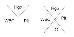 Schematics (also sometimes called "Fishbones") of shorthand for complete blood count commonly used by clinicians and healthcare providers. The shorthand on the right is used more often in the US. Hgb=Hemoglobin, WBC=White blood cells, Plt=Platelets, Hct=Hematocrit.