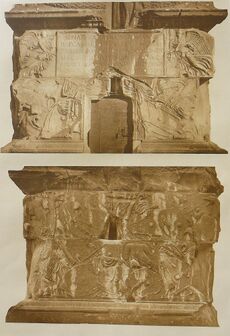 After Trajan's death in 117, the Roman Senate voted to have Trajan's ashes buried in the column's square base, which is decorated with captured Dacian arms and armor. His ashes and those of his wife, Plotina, were set inside the base in golden urns (which later disappeared from the monument). One reading of this is that Trajan may have intended the column to be his final resting place from the project's inception, and that the similarities in design to other funerary structures made it a natural choice for the Roman Senate.[21] In particular, the circumambulation demanded of onlookers of the column's frieze is evocative of Roman funerary practice, drawing attention toward the center – and consequently, the finial of Trajan.[22]