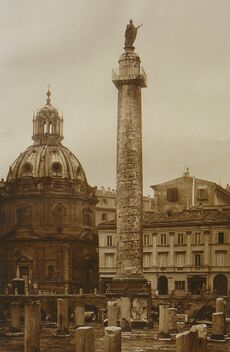 Trajan's Column was originally flanked by two sections of the Ulpian Library, a Greek chamber and a Latin chamber, which faced each other and had walls lined with niches and wooden bookcases for scrolls.[6][7][8] The Latin chamber likely contained Trajan's commentary on the Roman-Dacian Wars, the Dacica, which most scholars agree was intended to be echoed in the spiralling, sculpted narrative design of Trajan's Column.[9]