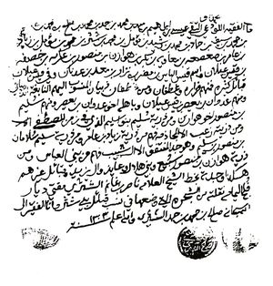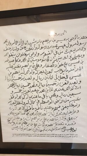 «من عبد الرحمن بن علي إلى الأخ الفاضل الأريب عیسی بن إبراهيم زاده الله من العلم والعمل والحياة الطيبة وحسن العمل سلام عليكم ورحمة الله وبركاته وبعد... وخطك الشريف وخطابك المنيف وصل أوصلك الله كل خير وسرور... وما ذكرت كان لدينا معلوما ومطلوبك يصل إليك إن شاء الله مع عمر ولا يخفاك يا أخي أن هذا الكتاب عزيز لدينا ولا نقل به في البلد فضلا السفر به ولكن ما أحببنا نتعذرك لأن ودنا بنفع الغير ... تقضون غرضكم منه ... وترسلونه مع من يصونه ...» سنة 1265هـ.