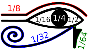 في نظام عد مصر القديمة، استخدمت عين حورس لتمثيل الكسور على الشكل (1) = 1/2 + 1/4 + 1/8 + 1/16 + 1/32 + 1/64 (أنظر الحساب عند قدماء المصريين).