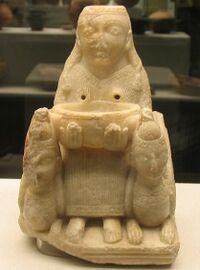 The "Lady of Galera" or "Goddess of Galera" (see image at left) was found in the 5th century BCE tomb number 20, zone 1 of the Necropolis.[4] It is a Phoenician figurine from the 7th century BCE[4] (similar to another found in Carthage, North Africa), made of alabaster, and probably represents the goddess Astarte.[4] The "lady" or "goddess" is seated between two sphinxes and has an opening through which liquid can be poured into it, which will emerge from small holes corresponding to the nipples of the breasts.[4] The robust forms of the figure suggest Mesopotamian influences; the stylization of the clothing and hair suggest Egyptian influences. It is believed that this sacred object was passed down for many generations before being used as part of a burial.
