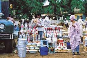 حد الأسواق في كوناكري، تُعرض فيه الأدوات المنزلية. وكوناكري عاصمة غينيا وكبرى المدن. وبعض الغينيين وخاصة الذين يعيشون في كوناكري والمدن الأخرى يرتدون الملابس ذات الطراز الغربي. ومع ذلك فإن معظم الغينيين لايزالون يرتدون الملابس التقليدية.