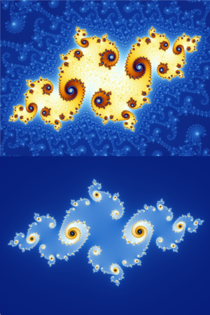In the outer part of the appendices, islands of structures may be recognized; they have a shape like Julia sets Jc; the largest of them may be found in the center of the "double-hook" on the right side