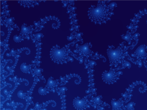 Part of the "tail" — there is only one path consisting of the thin structures that lead through the whole "tail". This zigzag path passes the "hubs" of the large objects with 25 "spokes" at the inner and outer border of the "tail"; thus the Mandelbrot set is a simply connected set, which means there are no islands and no loop roads around a hole.