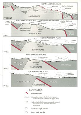 ووفقًا لنظرية تكتونية الكتل القارّية، فإن القشرة الخارجية للأرض تتكون من عدد من الطبقات الصلبة التي تكون في حركة مستمرة وبطيئة. خلال فترة الخمسة عشر مليون سنة الماضية، كوَّن صدع سان أندرياس حيزا بين قشرة المحيط الهادئ وقشرة شمال أمريكا، وخلال هذه الفترة تحرك ساحل كاليفورنيا مع بقية قشرة المحيط الهادئ مسافة 300 كم في اتجاه الشمال الغربي من أمريكا الشمالية. يتراوح متوسط مستوى الحركة على طول صدع سان أندرياس في الوقت الحاضر بين 5 و6 سم سنويا.