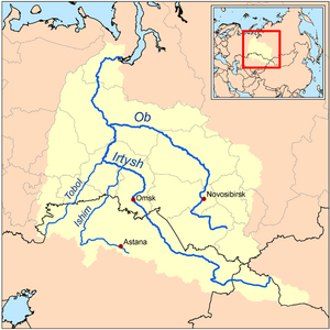 Leaving camp, they sailed 12 miles[5] down the Tobol to its junction with the Irtysh River at the modern Tobolsk. 12 miles east up the Irtysh was Sibir. The Russians captured the village of Atik-Murza for a base and unsuccessfully attacked Sibir. Several days later they attacked again. The commander, Mamet-Kul, was wounded which led to disorganization. The Ostyaks broke first, and then the Voguls, leaving only the Tatars. Kuchum fled during the night and the Russians entered his capital the next morning. This was probably in October 1582. The Russians had lost 107 men. Grousset[6] has the battle at 'a fortified camp at the mouth of the Tobol to protect the approaches to Sibir'. Naumov has it 'not far from Sibir'. A fort may have guarded the town further upriver, but the matter is not clear.
