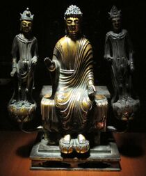 Right image: Amitabha Buddha and two assistants, gilded bronze, 7th century
