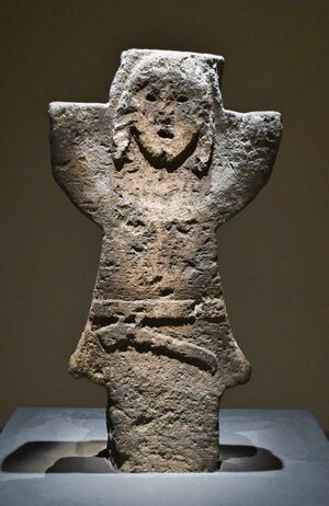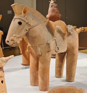 According to the Nihon Shoki, Silla was conquered by the Japanese Empress-consort Jingū in the third century.[25] However, due to lack of evidence,[26] this story is considered to be mythological in nature. It reported that the prince of Silla came to Japan to serve the emperor of Japan,[27] and lived in Tajima Province. Known as Amenohiboko, his descendants are the aforementioned Empress Jingū, and Tajimamori the god of sweets.[28] According to the Kojiki[29] and Nihon Shoki,[30] Geunchogo of Baekje presented stallions, broodmares and trainers to the Japanese emperor during Emperor Ōjin's reign.[31]