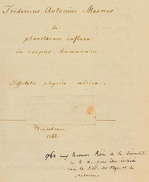 {{cite journal}}: Unknown parameter|trans_title=ignored (|trans-title=suggested) (help)CS1 maint: unrecognized language (link) - Kihlstrom JF (2002). "Mesmer, the Franklin Commission, and hypnosis: a counterfactual essay". The International Journal of Clinical and Experimental Hypnosis. 50 (4): 407–19. doi:10.1080/00207140208410114. ISSN 0020-7144. PMID 12362956.
