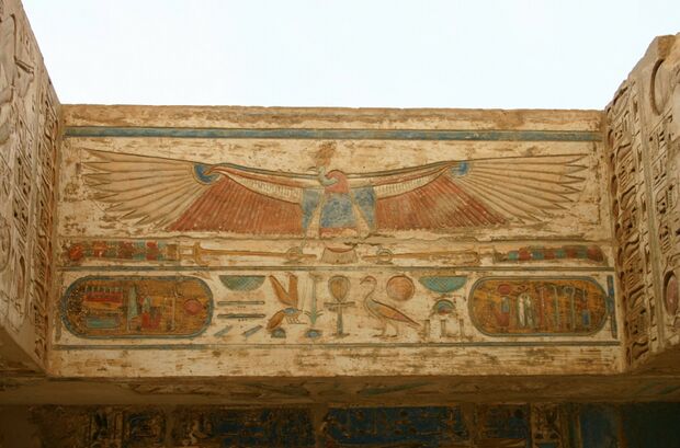 Osiris is shown to wear the Atef crown, which is an elaborate Hedjet with feathers and disks. Depictions of kings wearing the Atef crown originate from the Old Kingdom.