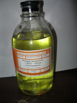 Drugstore-made ~400 mL aqueous solution of Furacilin (روسية: Фурацилин, nitrofural), 1 : 5000 (0.2 mg/mL or 0.02%), ready for topical use.