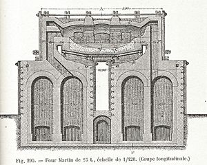 في عام 1865، حصل المهندس الفرنسي پيير-إميل مارتان على ترخيص من سيمنز، واستخدم الفرن لصناعة الصلب. عرفت تلك العملية باسم عملية سيمنز - مارتن ، وعرف الفرن باسم فرن المجمرة المكشوفة . تعد أهم مميزات فرن سيمنز هي قدرته على الإنتاج السريع لكميات كبيرة من الصلب القاعدي، المستخدم في بناء ناطحات السحاب. تبلغ سعة الفرن من 50 إلى 100 طن، ولكن في بعض الأحيان تصل إلى 250 أو حتى 500 طن. عملية سيمنز-مارتان تتمم طريقة بسمر ولا تستعيض عنها. وهي بطيئة مما يجعل من السهل السيطرة عليها. كما يمكن استخدامها لصهر كميات كبيرة من الخردة، مما يخفض من تكاليف إنتاج الصلب، يعيد تدوير الخردة التي يصعب التخلص منها.