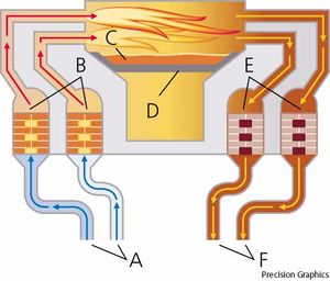 ويوجد في كل طرف من أطراف فرن المجمرة المكشوفة حارق للوقود وغرفة يطلق عليها غرفة المضلعات. وتحتوي هذه الحجرات على رصّات من الطوب الحراري منسقة في نمط مضلع. ووجود هذه التضليعات هو الذي يمد الفرن بالعديد من المسارات التي يمكن للهواء والغازات الفاقدة أن تنساب خلالها. وبينما يحترق الموقد عند أحد الأطراف فإن غازات العادم تسحب خلال غرفة المضلعات في الطرف الآخر. وهكذا فإن غازات العادم الساخنة ترفع درجة حرارة غرفة المضلعات أثناء مرورها في الفرن. وينطفئ الموقد في الفرن بصفة أتوماتيكية كل خمس عشرة دقيقة، ومع انطفائه ينعكس اتجاه سريان الغازات في الفرن. ولهذا يسخن الهواء في طريقه إلى المجمرة أثناء مروره بحجرة المضلعات الساخنة. وتحتوي معظم أفران المجمرة المكشوفة أيضًا على رمح للأكسجين في سقف الفرن، حيث يضغط الأكسجين النقي المطلوب للفرن خلال هذا الرمح، ويساعد ذلك على رفع درجة حرارة الشحنة والإسراع في عملية الصهر.