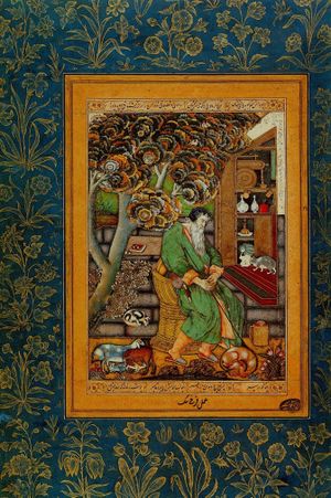 فروخ بگ. "بابر يعتلي العرش"، بابرنامه. 1589 معرض ساكلر، واشنطن. |