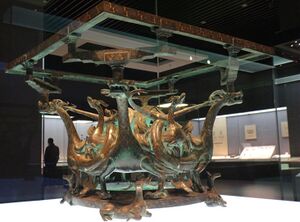 Bronze artifacts also have significant meaning and roles in the Han dynasty as well. People used them for funerary purposes which reflect the aesthetic and artistic qualities of the Han dynasty.[5] Many bronze vessels excavated from tombs in Jiangsu Province, China, have various shapes like Ding, Hu, and Xun which represent traditional Chinese aesthete.[5] These vessels are classical representations of Chinese celestial art forms which play a great role in ancient Chinese's communication with spirits of their ancestors.[5] Other than the vessels, bronze weapons, daily items, and musical instruments are also found in royal Han families' tomb in Jiangsu. Being able to put a full set of Bianzhong in ones tomb signifies his or her status and class in the Han dynasty since this particular type of instrument is only acquired and owned by royal and wealth families.[5] Apparently, Bianzhong and music are also used as a path for the Han rulers to communication with their Gods.[5] The excavation of Bianzhong, a typical and royal instrument found in ancient China, emphasizes the development of complex music systems in the Han dynasty.[5] The set of Bianzhong can vary in many cases; for example, a specific excavation of Bianzhong from Jiangsu Province include different sets of bells, like Niuzhong and Yongzhong bells, and many of them appear in animal forms like the dragon, a traditional Chinese spiritual animal.[5]