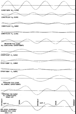 ]دالة الموجة في الأسفل تعلوها مراحل التحليل التوافقي حتى الوصول إلى مركبات الموجة الأساسية .