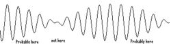 Some trajectories of a harmonic oscillator (i.e. a ball attached to a spring) in classical mechanics (A-B) and quantum mechanics (C-H). In quantum mechanics, the position of the ball is represented by a wave (called the wavefunction), with the real part shown in blue and the imaginary part shown in red. Some of the trajectories (such as C,D,E,and F) are standing waves (or "stationary states"). Each standing-wave frequency is proportional to a possible energy level of the oscillator. This "energy quantization" does not occur in classical physics, where the oscillator can have any energy.