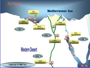 يوجد ثلاث مصافي نفط ضخمة على الساحل الشمالي في مصر، [4] وهي مصافي ألكس (5 مگا طن)، ميدور (5 م.ط.)، أميرة (3.7 م.ط.). وفي القاهرة توجد أكبر مصفاة بمصر في مسطرد وتتبع الشركة المصرية للتكرير.