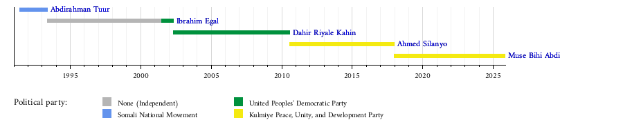 2017 | 13 December 2017 | Incumbent | 7 years, 329 days | Peace, Unity, and Development Party (KULMIYE) | |